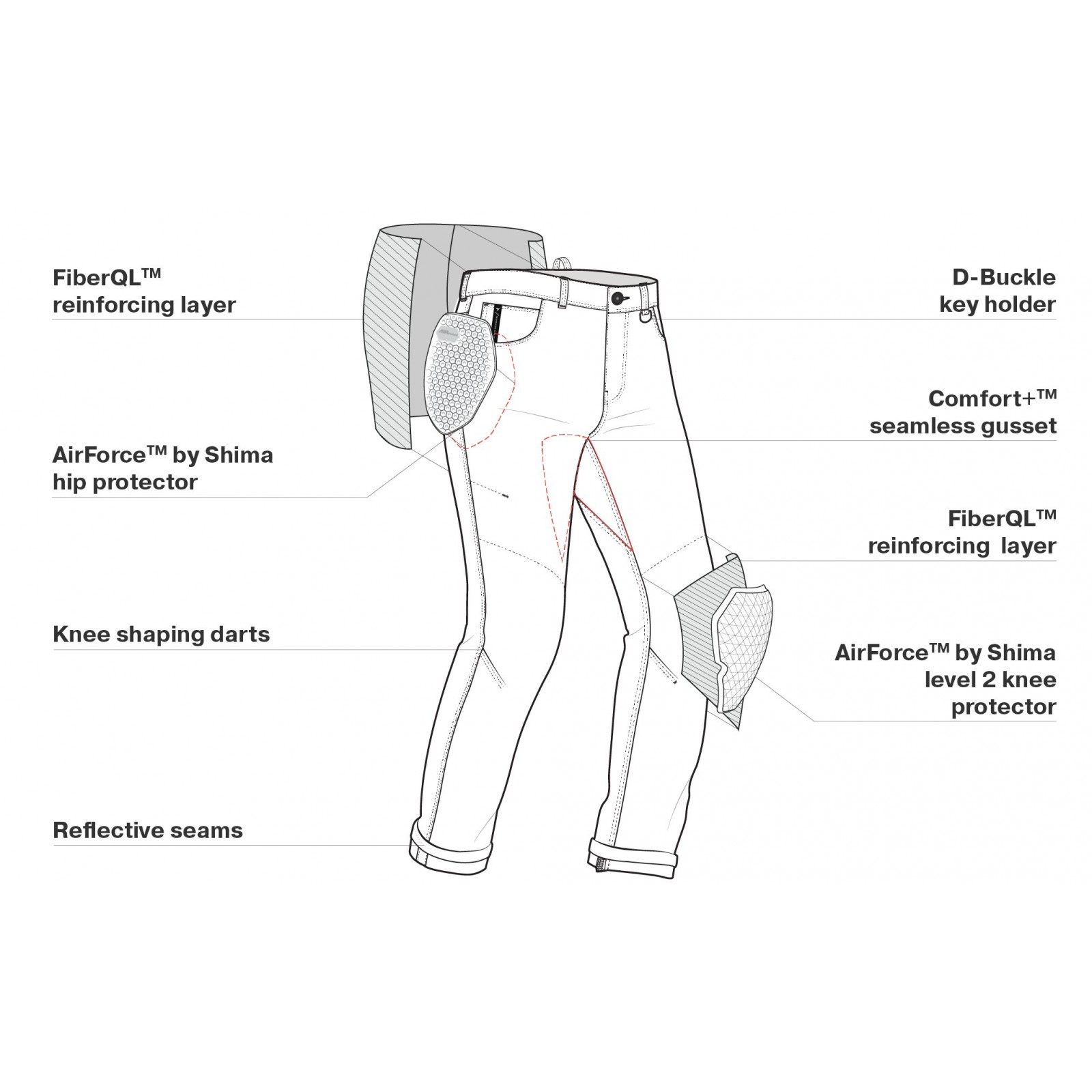 Αντρικό παντελόνι μοτοσυκλέτας jean DEVON με μέγιστη προστασία, εξαιρετική αναπνοή, κλασική εφαρμογή και διακριτικό στυλ για χρήση όλο τον χρόνο. Επενδεδυμένο με υλικό FiberQL™ που εγγυάται υψηλή αντοχή στην τριβή και ευχάριστη αίσθηση δροσιάς. Διαθέτει σετ αναπνεύσιμων προστατευτικών AirForce™ της SHIMA (γόνατο LEVEL 2, HIP LEVEL 1) για μέγιστη προστασία και ασφάλεια. Απολαύστε την τέλεια εφαρμογή με την τεχνολογία Comfort+™ και ταπροστατευτικά των γονάτων που σας δίνουν την δυνατότητα εσωτερικά να τα προσαρμόσετε σε δύο διαφορετικά ύψη για άψογη εφαρμογή. Μπορείτε επίσης να εξοπλίσετε το παντελόνι με έξτρα προστατευτικό για την μέση (πωλείται ξεχωριστά). Τα ανακλαστικά στοιχεία στο κάτω μέρος του ποδιού θα σας κρατήσουν ορατούς στις βραδινές σας βόλτες. Διαθέτει φερμουάρ που επιτρέπει να το συνδυάσετε με jacket μοτοσικλέτας.